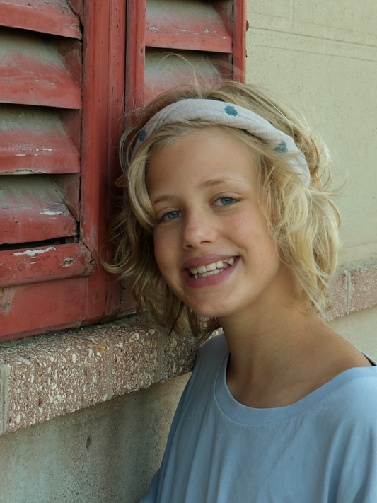 Schmales Musselin-Haarband, Naturweiß mit Handbemalten Blauen Punkten