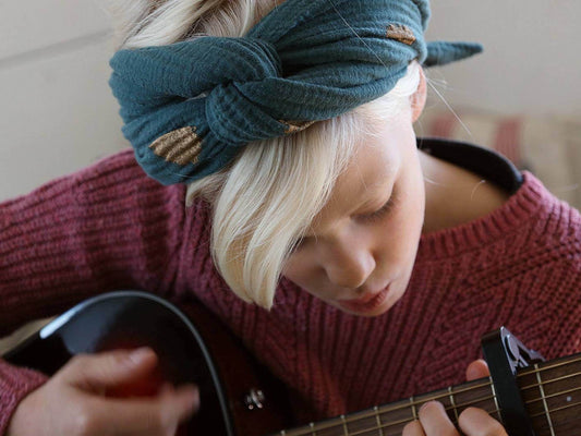 Breites Kopftuch aus Bio-Musselin, Ozeangrün mit Handbemalten Goldkupfer-Punkten