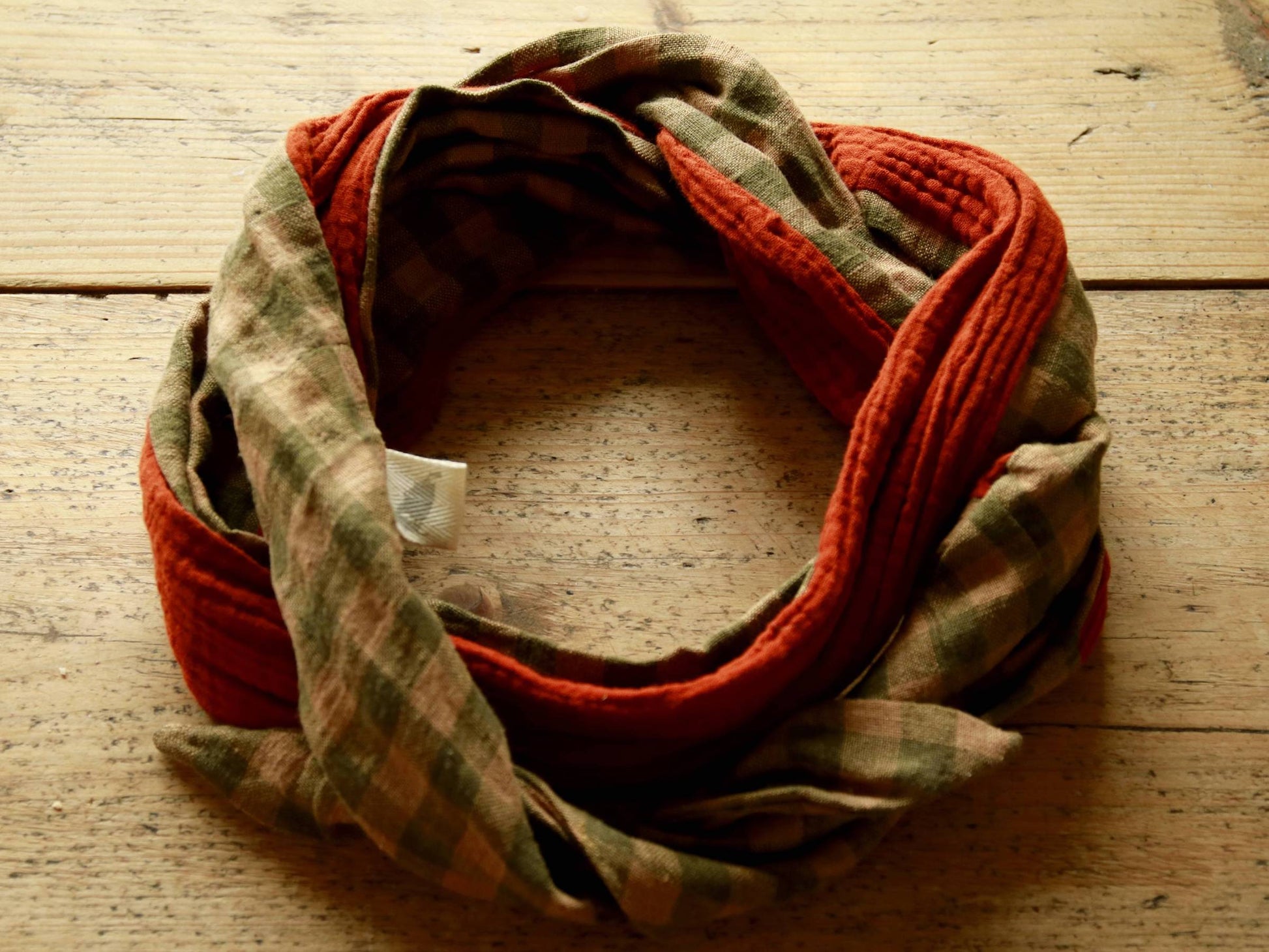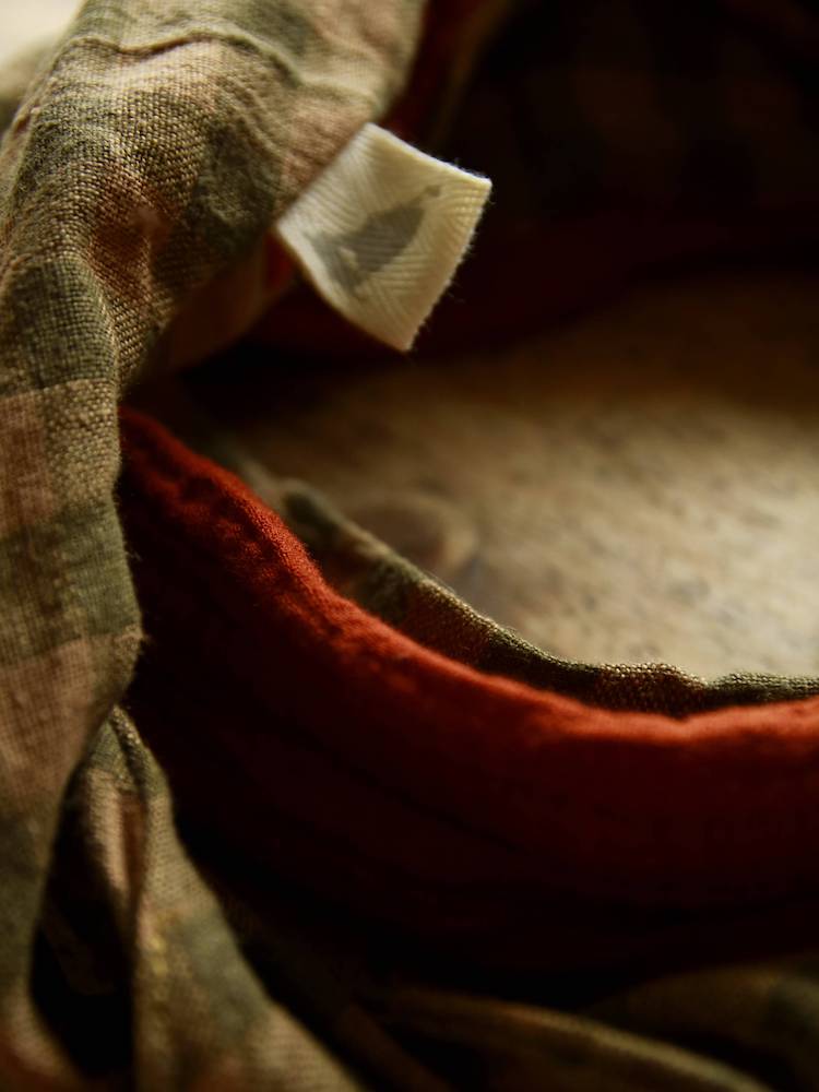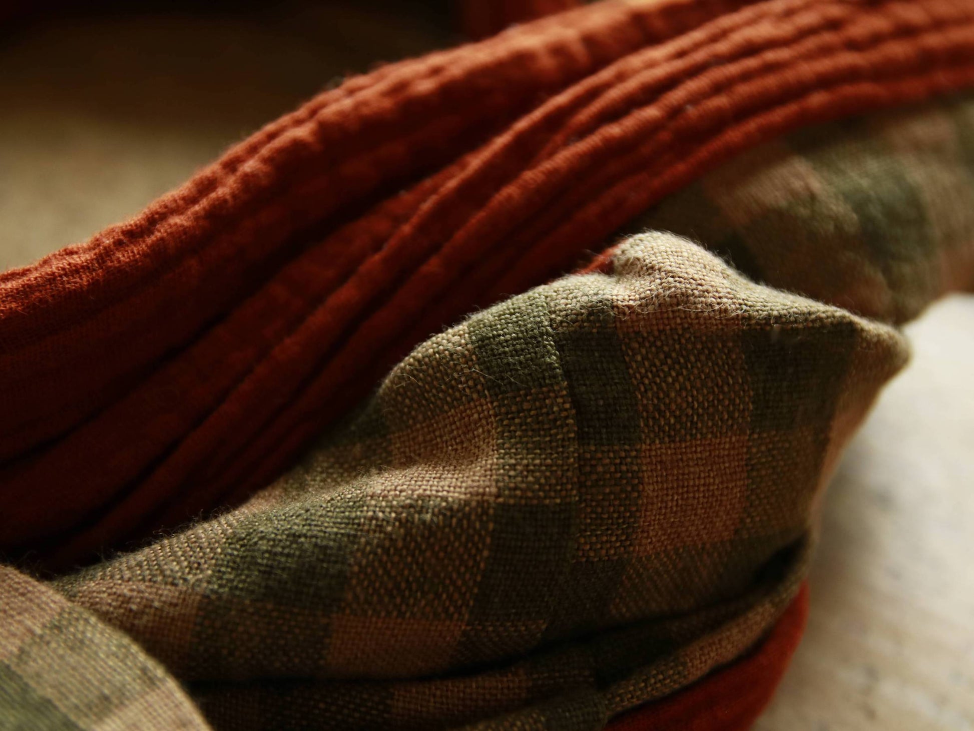 On our journey of discovery for special fabrics, we fell in love: with this unique linen fabric from England! It is robust, green and beige checked and - in our opinion - goes perfectly with our airy, rust-red, two-layer organic cotton muslin. It's practical because it's great to tie: a knot at the top, a knot at the bottom, more classic, cool or playful... whatever you like it best! Besides that It's up to you to choose whether you want to twist the scarf so that both sides are visible (like in the pictures), or whether you prefer to tie it so that only one side is dominant.