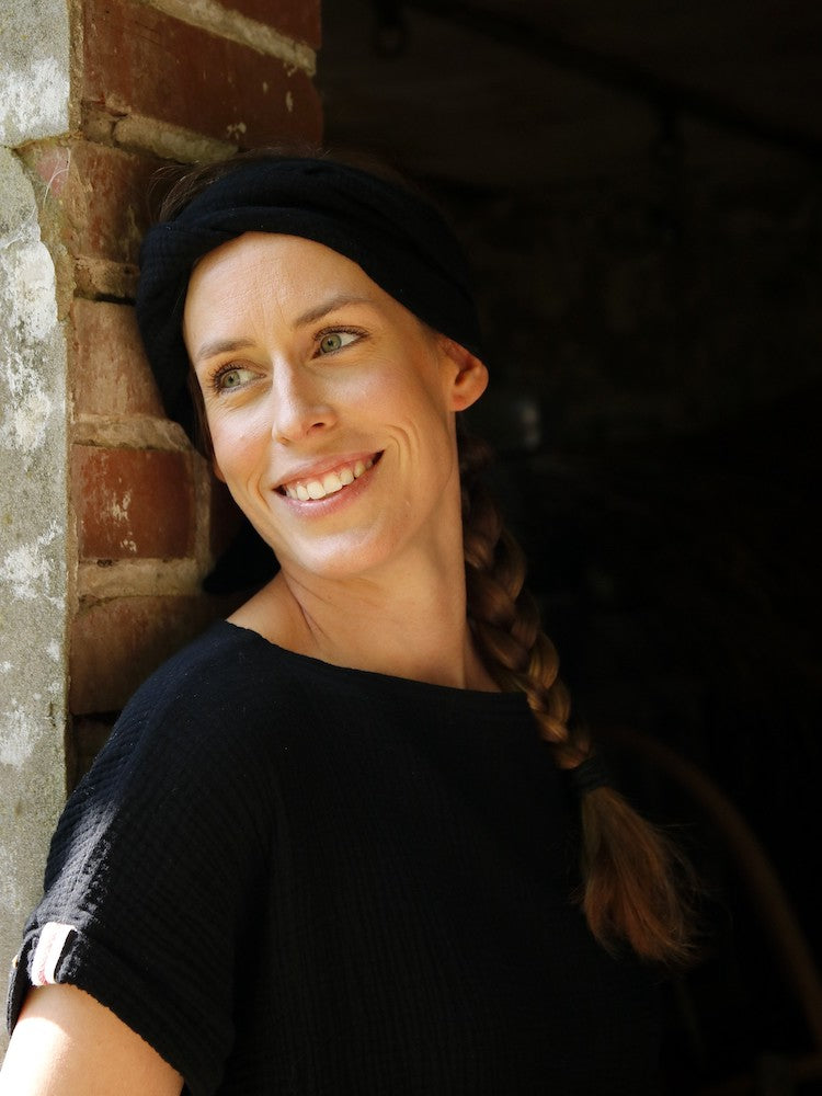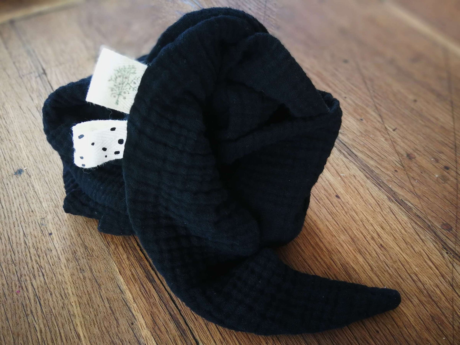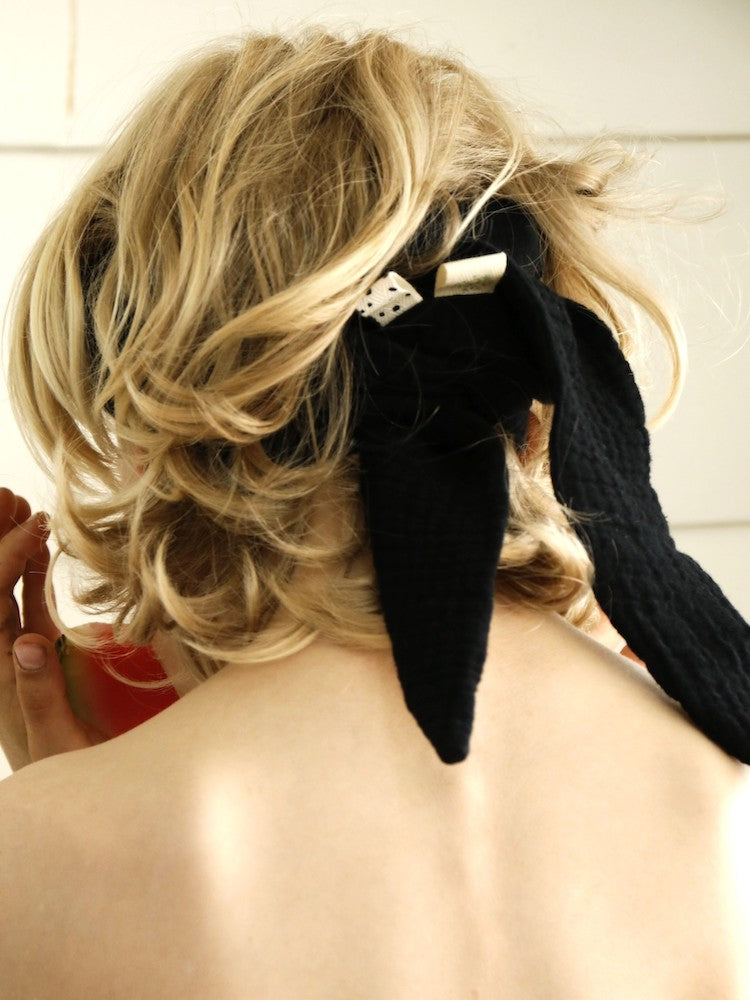 This special headscarf is made from a delicate, black two-layer organic cotton muslin. In addition to our label, we have sewn in a red ribbon at one end - a small, but special detail! It's practical because it's great to tie: a knot at the top, a knot at the bottom, more classic, cool or playful... whatever you like it best!