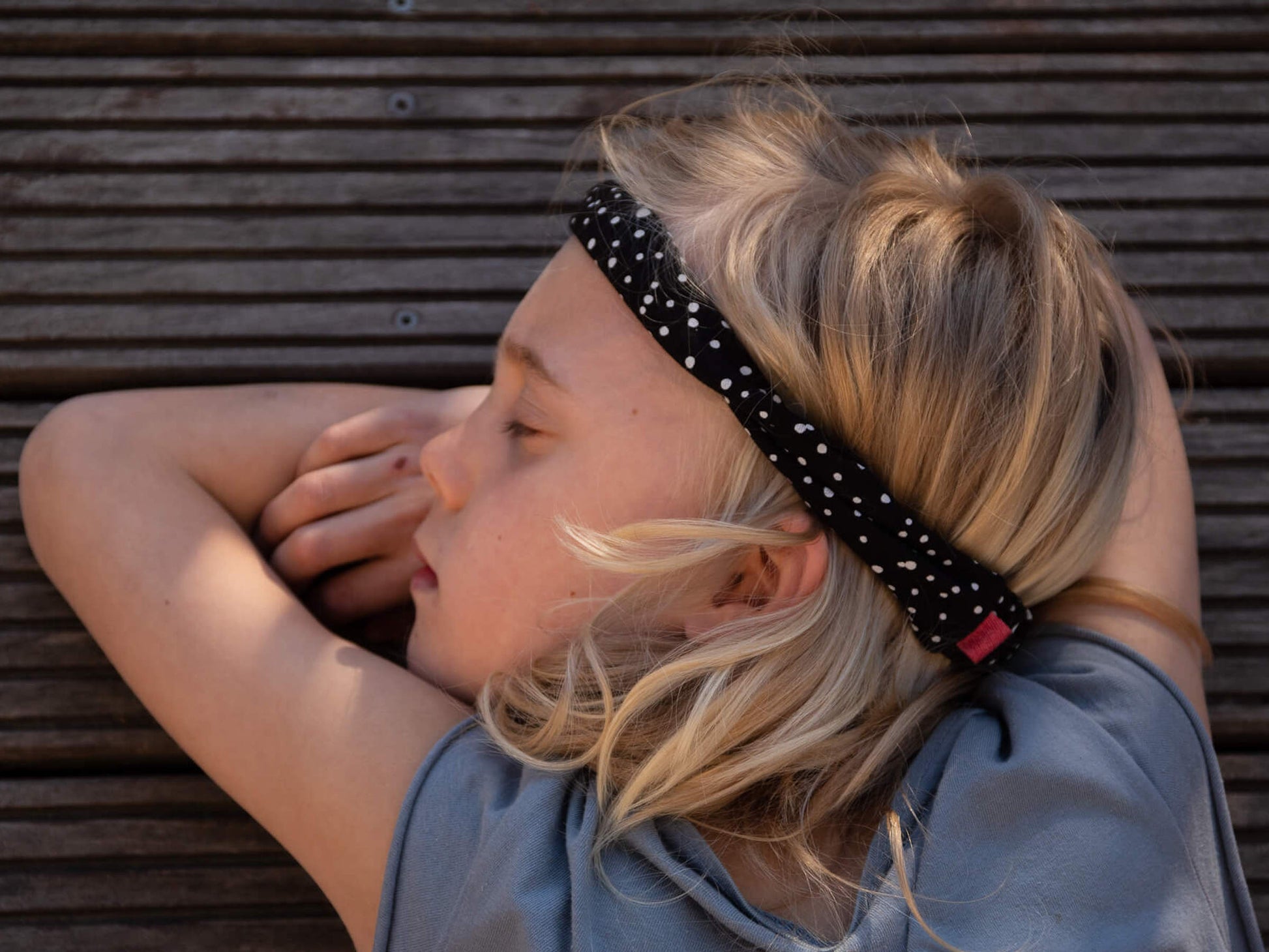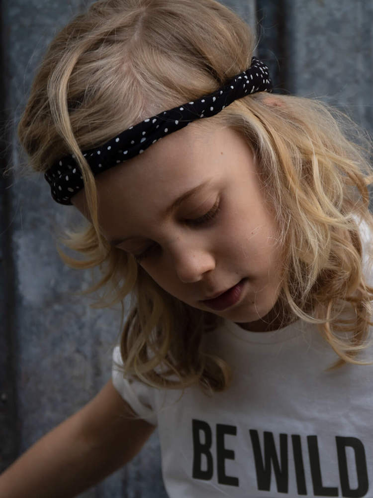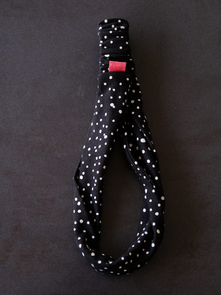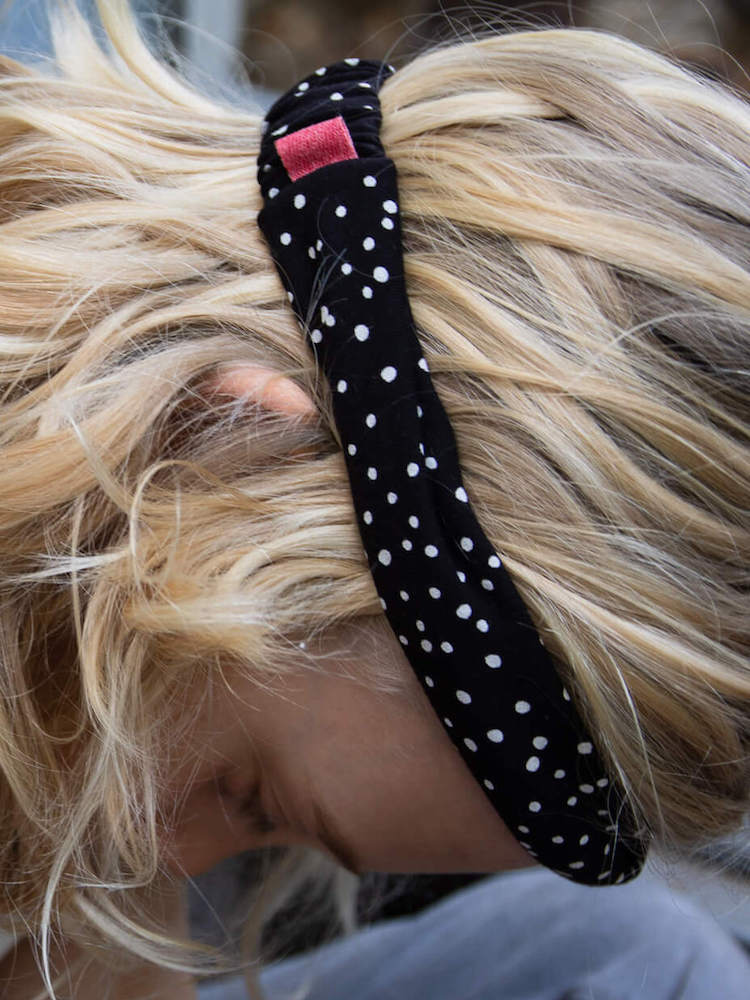 The headband is sewn from a black jersey with white polka dots and is pleasantly soft on the skin. At the back it is decorated with an elastic piece with an internal elastic band and a hand-painted cream-white woven band with gray dots - a small but special eye-catcher!