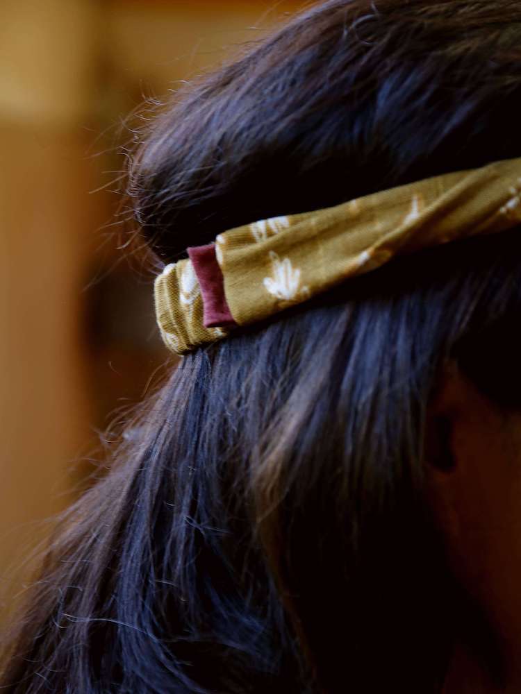 This hairband is sewn for you from a very special, flowery, green, two-layer muslin. The band is twisted several times and sits particularly beautifully thanks to this technology. At the back, the band is set off with an elastic piece with an internal rubber band and a special woven band (also made of muslin) in a warm dusty red .