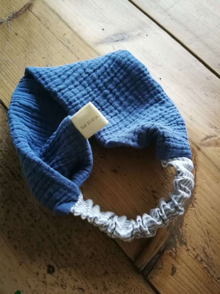 Like a painting from ancient times, this blue headband makes eyes shine! It consists of a very beautiful blue, two-layer cotton muslin. At the back it is set off with an elastic piece in blue and white stripes!