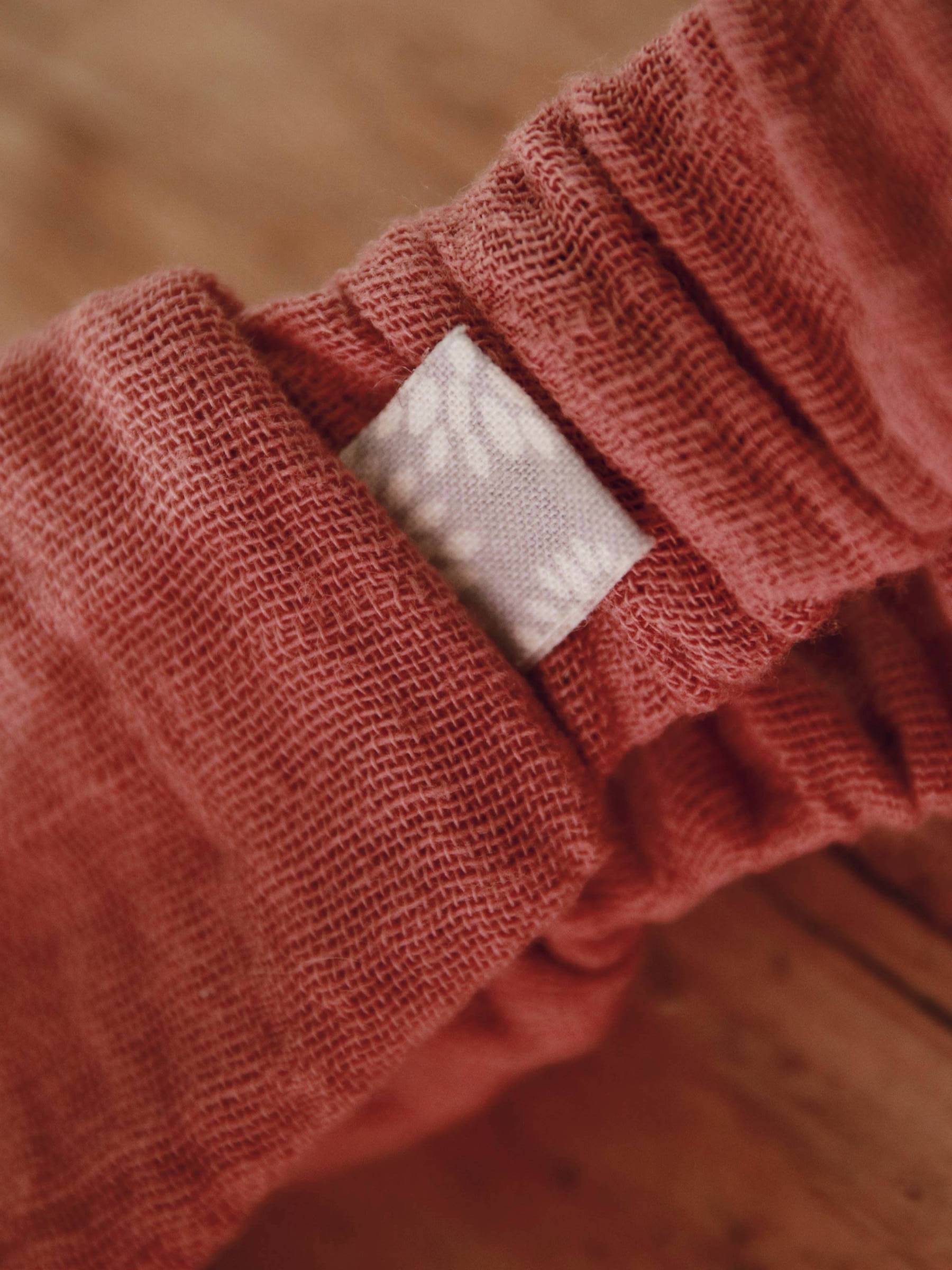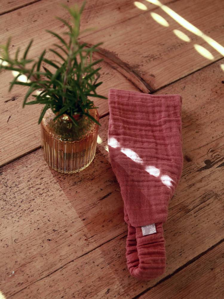 The warmth of light terracotta combined with the floral soft blue of the woven ribbon... unique! It consists of a very beautiful two-layer cotton muslin, set off at the back with an elastic piece and a woven band in light blue and a slightly floral pattern!
