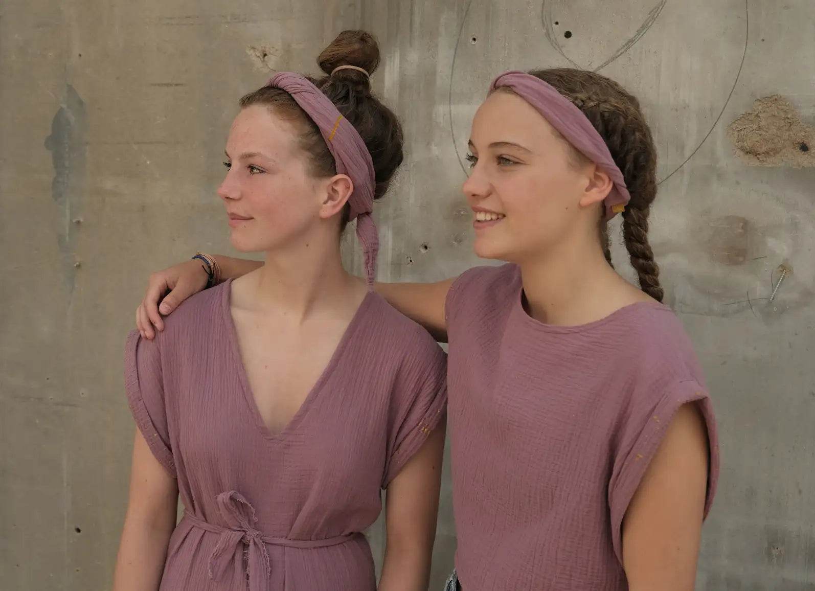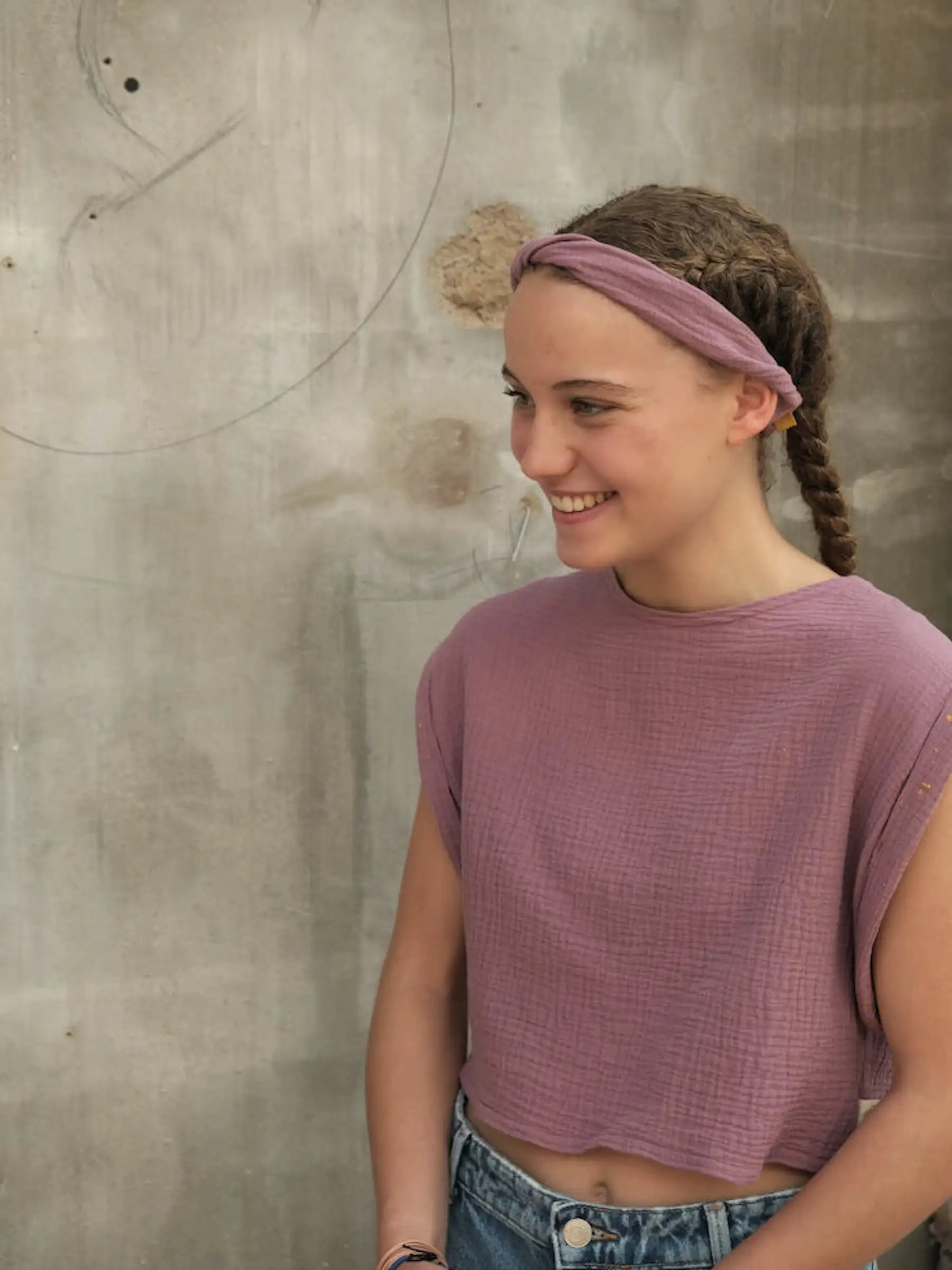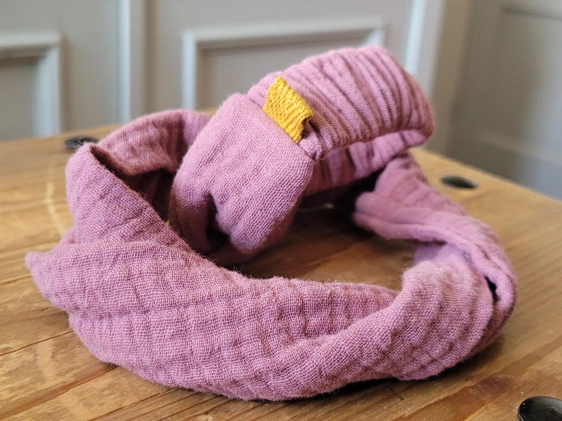 A bit of berries and some warm yellow sandy beach? This beautiful color combination is available here, with this special hair band! The pink tone is dark and intense and the yellow ribbon goes very well with its warmth. We use this soft, two-layer organic cotton muslin to make a hair band that has been twisted several times, which fits particularly beautifully thanks to this technique. At the back the band is set off with an elastic piece with an internal rubber band. We can adjust the size so that the band fits well on both children and adults.