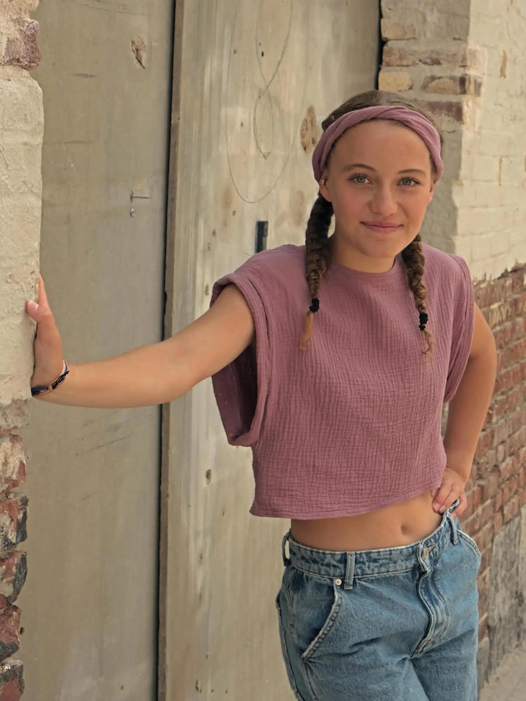 Narrow hairband made of organic muslin, old pink with hand-dyed woven ribbon