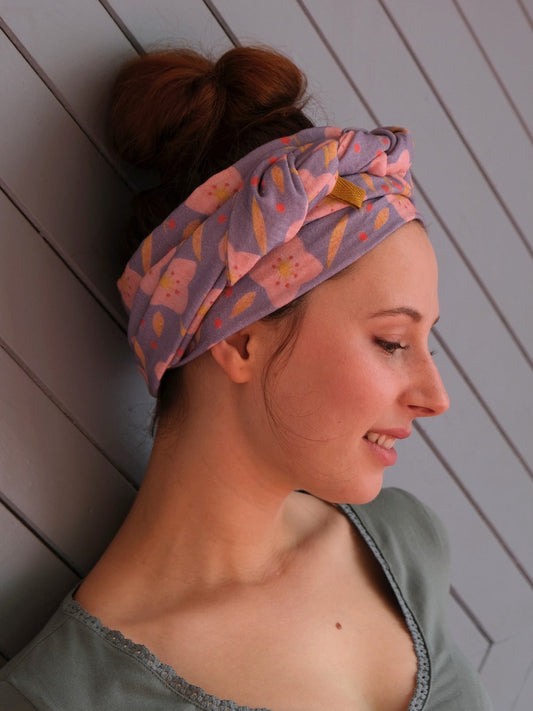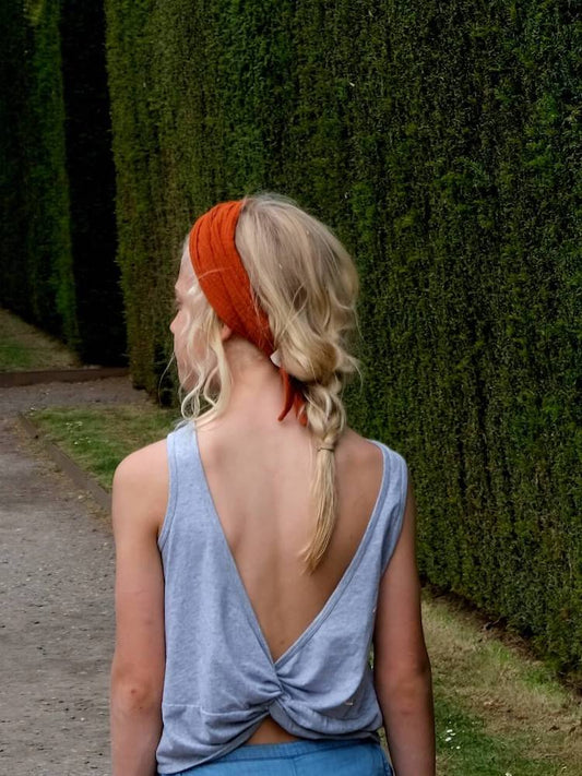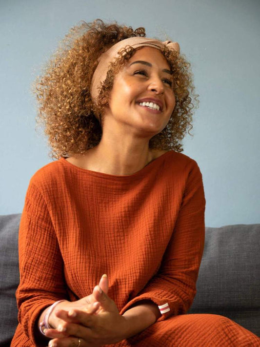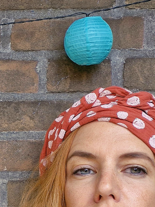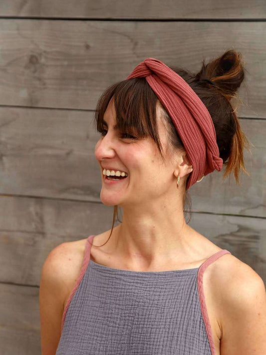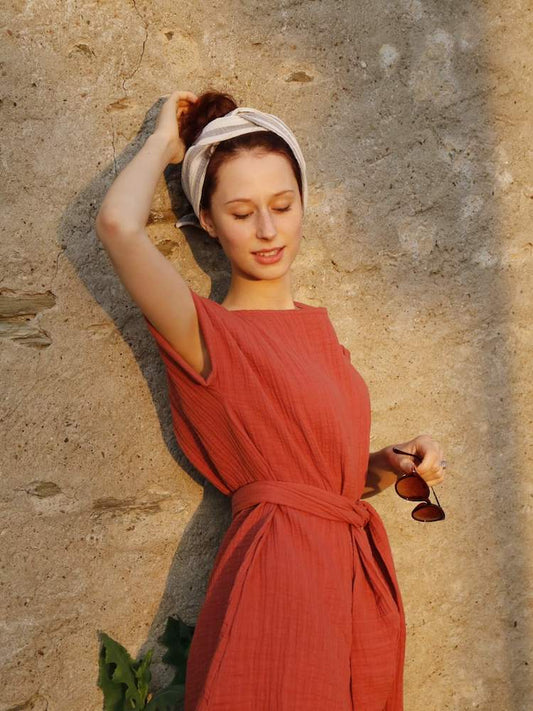 Hoofddoek van biologische mousseline, roestrood met handgeschilderd geweven lint