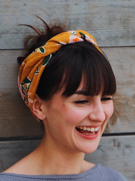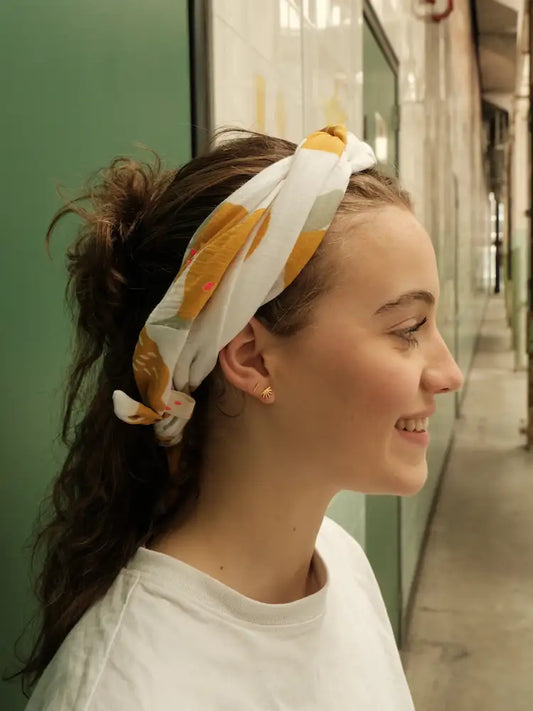 Mousseline hoofddoek, zonnig geel met bloemmotief
