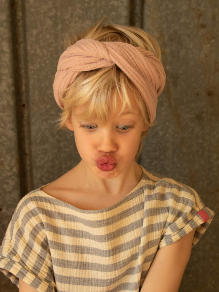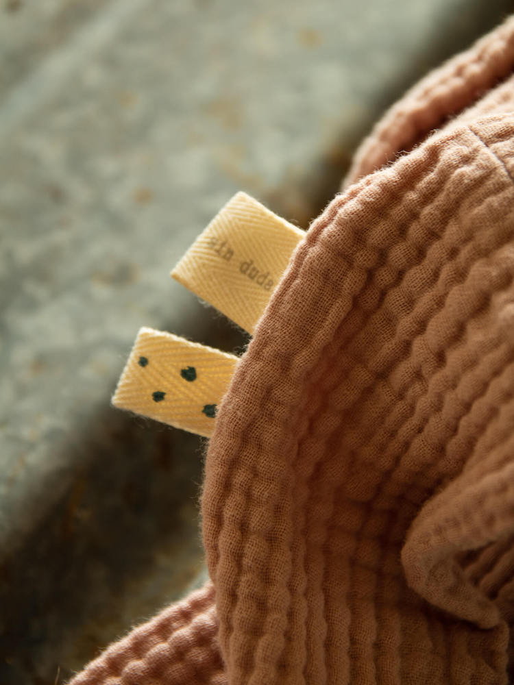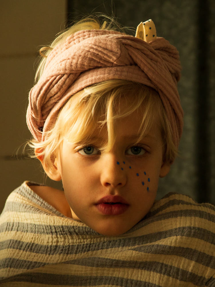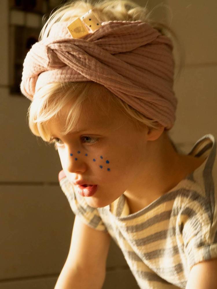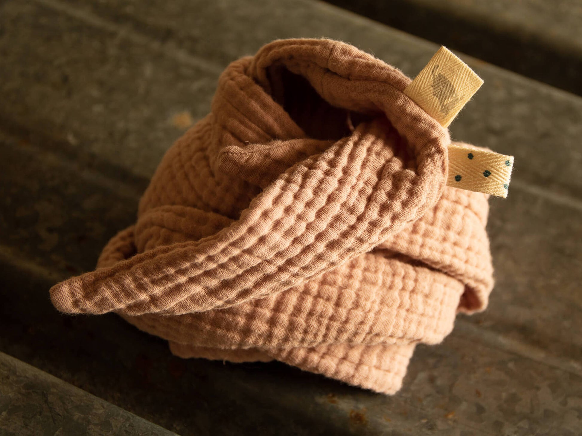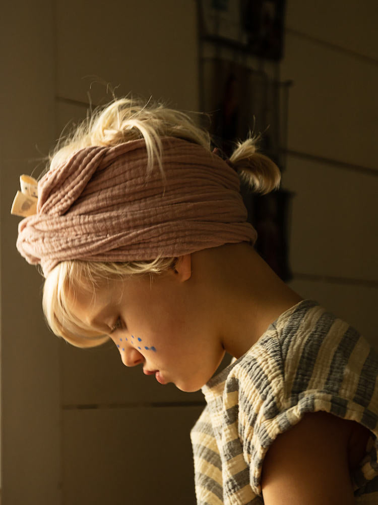 De hoofddoek is gemaakt van een donzige, drielaagse oudroze katoenen mousseline. Als aanvulling op ons label hebben we een crèmewit geweven lint met aan één uiteinde handgeschilderde blauwe stippen genaaid. Een kleine, maar bijzondere details! Praktisch omdat het leuk is om te strikken: een knoopje bovenaan, een knoopje onderaan, klassieker, stoer of speels... wat jij zelf het leukst vindt!