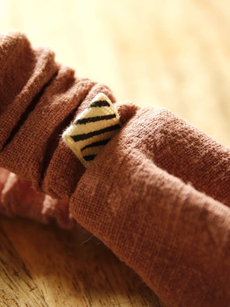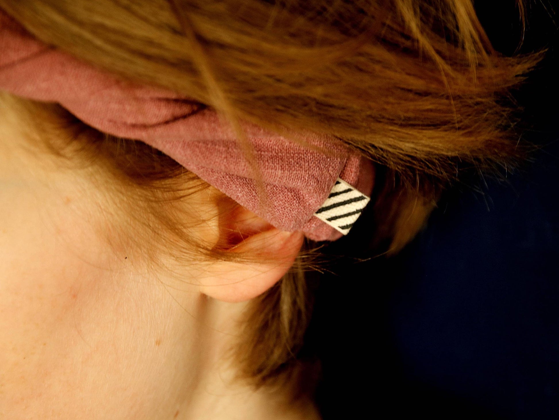 De haarband is genaaid van linnen in de kleur oudroze en voelt aangenaam zacht aan op de huid. Aan de achterkant is hij afgezet met een elastisch stuk met een rubberen band aan de binnenkant, terwijl een crèmewitte geweven band met zwarte diagonale strepen als extra kleine blikvanger fungeert.